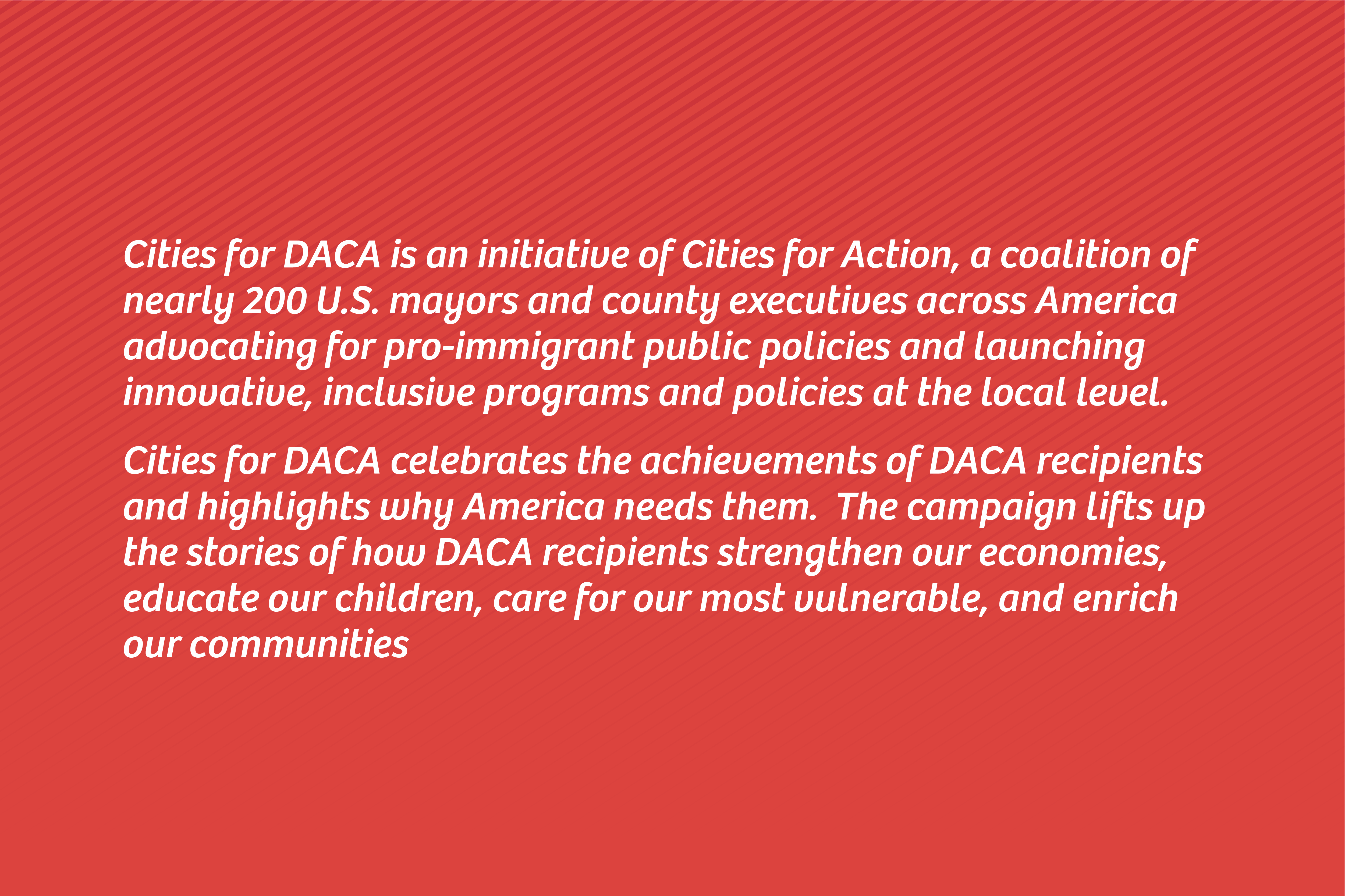 The campaign leveraged diverse voices of leadership both to counteract the negative narrative strategies that stigmatize immigrants and to keep DACA recipients, their loved ones, and additional affected communities updated about the status of the DACA program. All resources were designed to be evergreen templates that Cities for Action can carry forward toward future initiatives of support for immigrant communities.